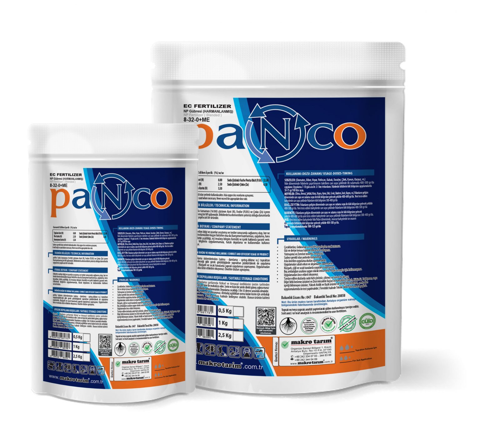 paNco; Suda tamamen (%100) çözünen Azot(N), Fosfor(P205) ve Çinko (Zn) içeren Harmanlanmış NP gübresidir. Bitkilerde bu elementlerin yetersiz olduğu durumlarda uygulama yapılacak bir üründür.